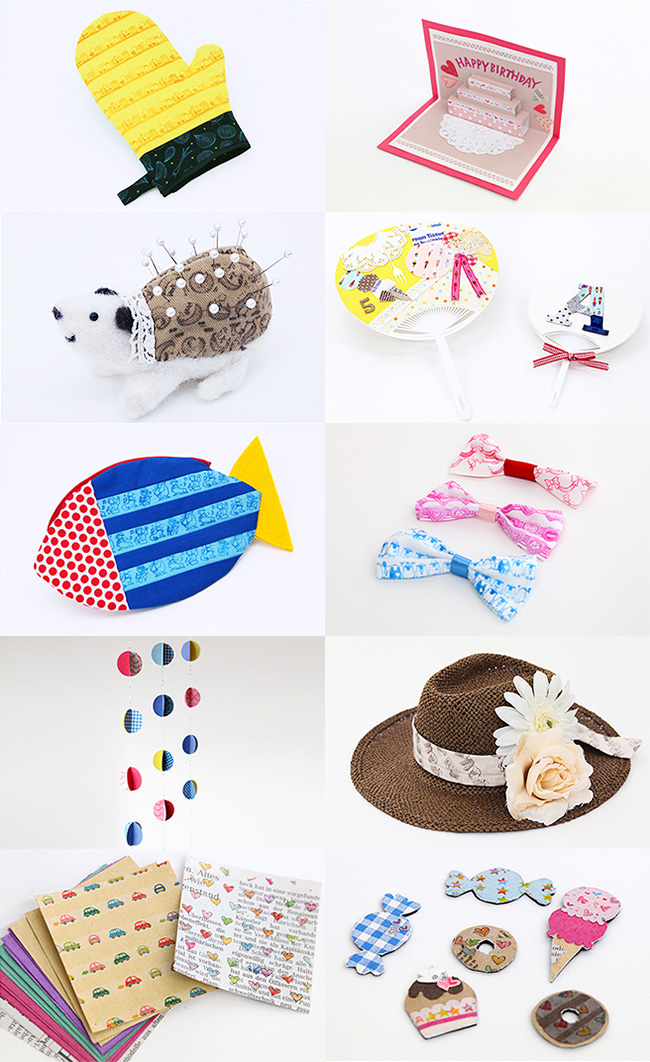 また、布製品に使用できるデコルノのほうは、手芸好きな方のために、オリジナルのテキスタイルとして身近なものを制作してもらいたいと、様々な小物に加工してみました。