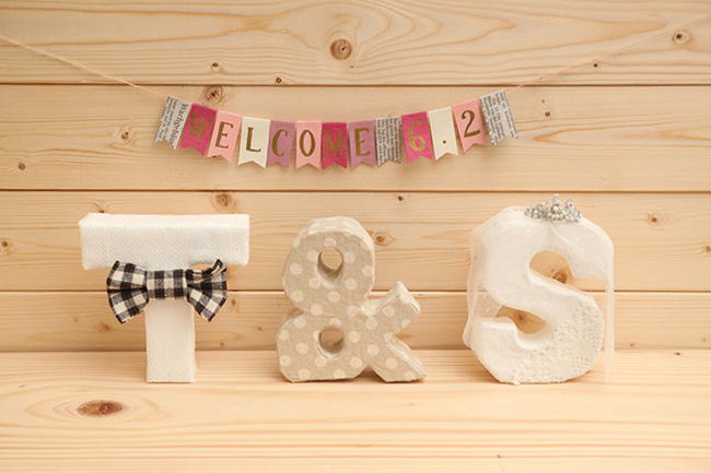 新郎新婦のイニシャルを立体にしたオブジェは、当日の二人の衣装をオブジェで表現することで、意外性とかわいらしさを表現しました。