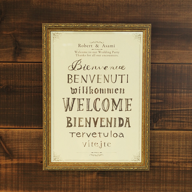 各国の言葉で「ようこそ」のタイポグラフィをデザインしたボードは、国際結婚や外国人の友人が多い時に、ゲストに喜んでもらえると同時に、色々な書体を手描きで描くことで、手作りの温かみを伝えながらも、スタイリッシュになるように制作しています。